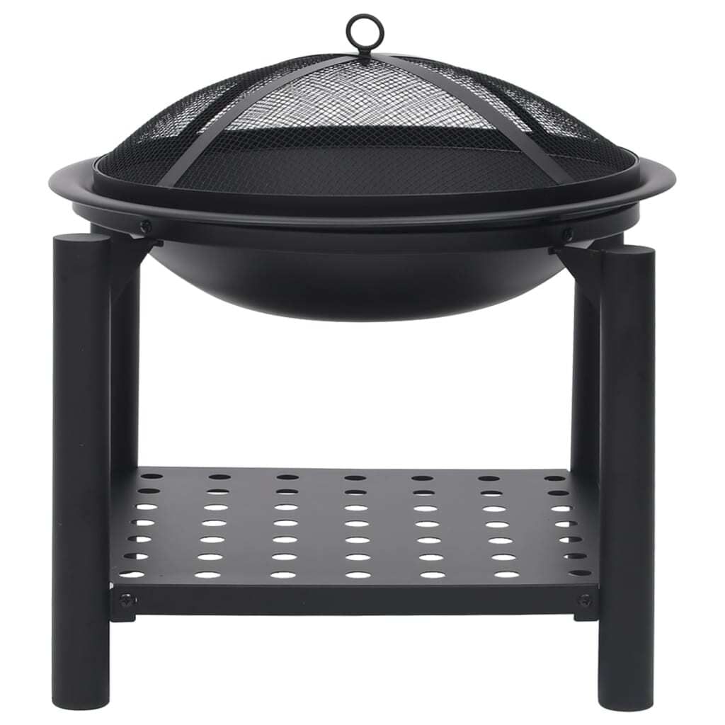 Made of steel, the fire pit is excellent in absorbing and radiating heat. Featuring a large bowl, this fireplace allows for a large fire for you and your family to enjoy for hours. The mesh allows you to watch the burning fire, and encloses the fire for safety as well as preventing sparks and debris from flying out. Additionally, there is a convenient ring in the mesh cover so that you can carry it easily. The included poker can be used for both removing the mesh cover and rearranging the logs. What’s more, the shelf provides additional storage space to put more firewood.